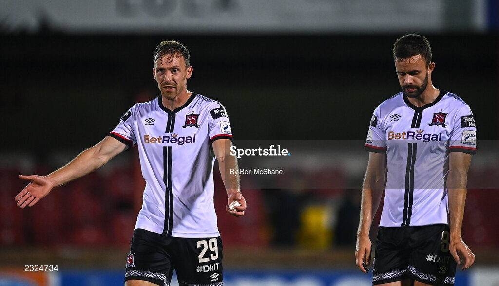 29 August 2022; David McMillan, left, and Robbie Benson of Dundalk react after their side's defeat in the SSE Airtricity League Premier Division match between Sligo Rovers and Dundalk at The Showgrounds in Sligo. Photo by Ben McShane/Sportsfile