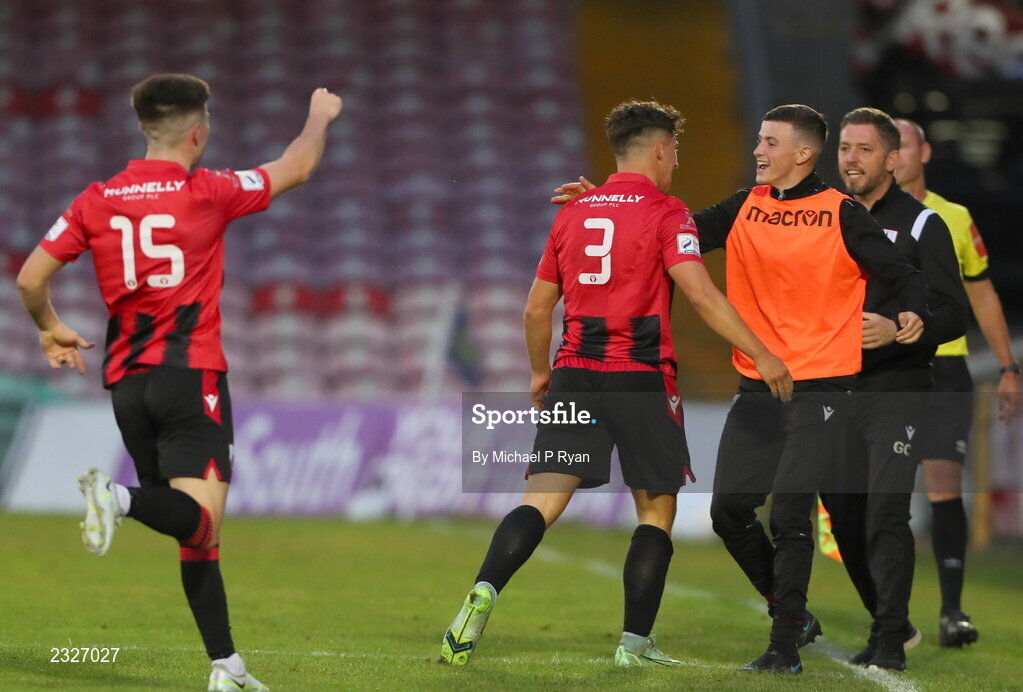 2 September 2022; Dylan Barnett of Longford Town, centre, celebrates after scoring his side's first goal during the SSE Airtricity League First Division match between Cork City and Longford Town at Turners Cross in Cork. Photo by Michael P Ryan/Sportsfile