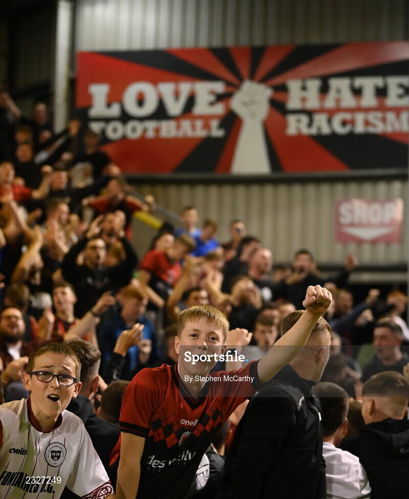 2 September 2022; Bohemians supporters celebrate after the SSE Airtricity League Premier Division match between Bohemians and Shamrock Rovers at Dalymount Park in Dublin. Photo by Stephen McCarthy/Sportsfile