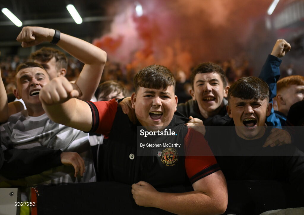 2 September 2022; Bohemians supporters celebrate their goal during the SSE Airtricity League Premier Division match between Bohemians and Shamrock Rovers at Dalymount Park in Dublin. Photo by Stephen McCarthy/Sportsfile