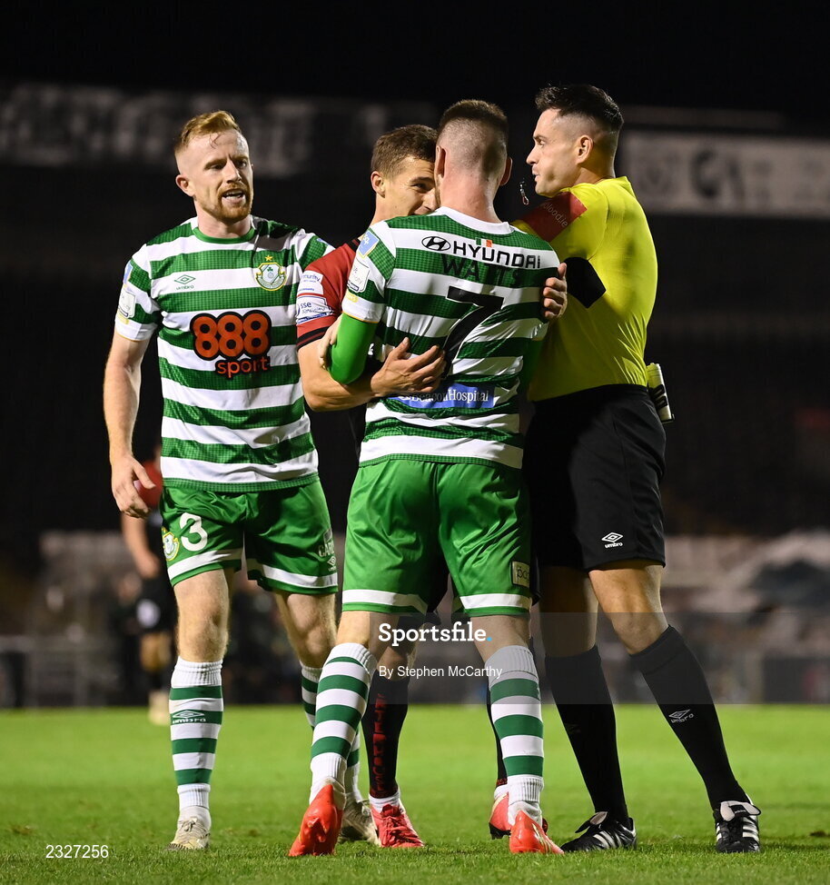 2 September 2022; Tyreke Wilson of Bohemians and Dylan Watts of Shamrock Rovers are seperated by referee Rob Hennessy and Sean Hoare of Shamrock Rovers during the SSE Airtricity League Premier Division match between Bohemians and Shamrock Rovers at Dalymount Park in Dublin. Photo by Stephen McCarthy/Sportsfile