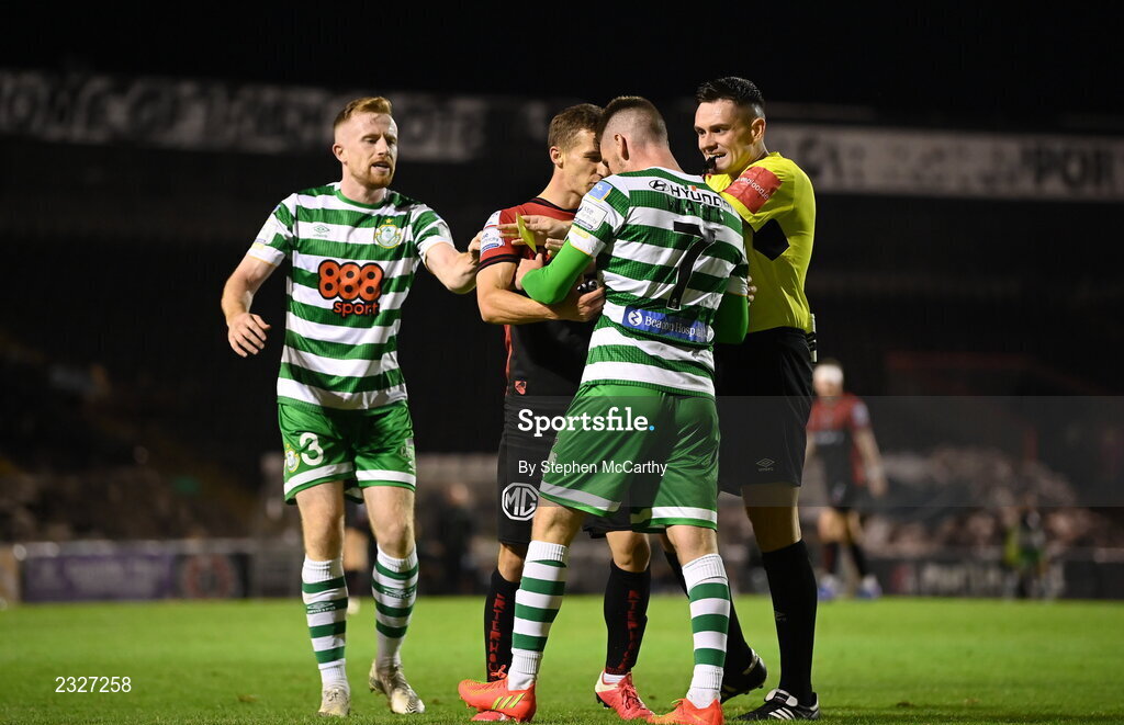 2 September 2022; Tyreke Wilson of Bohemians and Dylan Watts of Shamrock Rovers are seperated by referee Rob Hennessy and Sean Hoare of Shamrock Rovers during the SSE Airtricity League Premier Division match between Bohemians and Shamrock Rovers at Dalymount Park in Dublin. Photo by Stephen McCarthy/Sportsfile