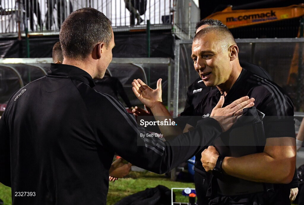 2 September 2022; Bohemians interim managers Trevor Croly, right, and Derek Pender celebrate their side's victory after the SSE Airtricity League Premier Division match between Bohemians and Shamrock Rovers at Dalymount Park in Dublin. Photo by Seb Daly/Sportsfile