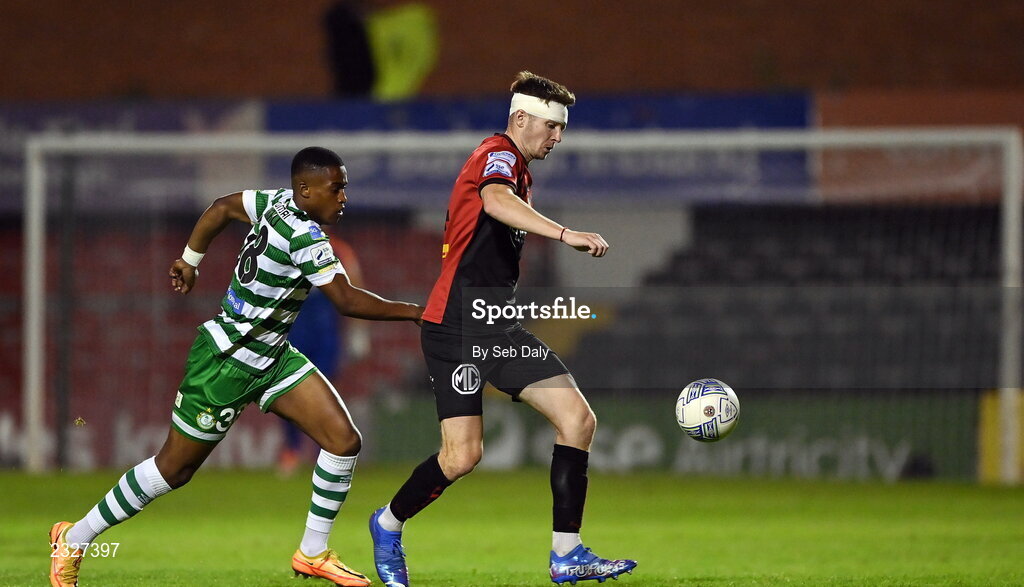 2 September 2022; Rory Feely of Bohemians in action against Aidomo Emakhu of Shamrock Rovers during the SSE Airtricity League Premier Division match between Bohemians and Shamrock Rovers at Dalymount Park in Dublin. Photo by Seb Daly/Sportsfile