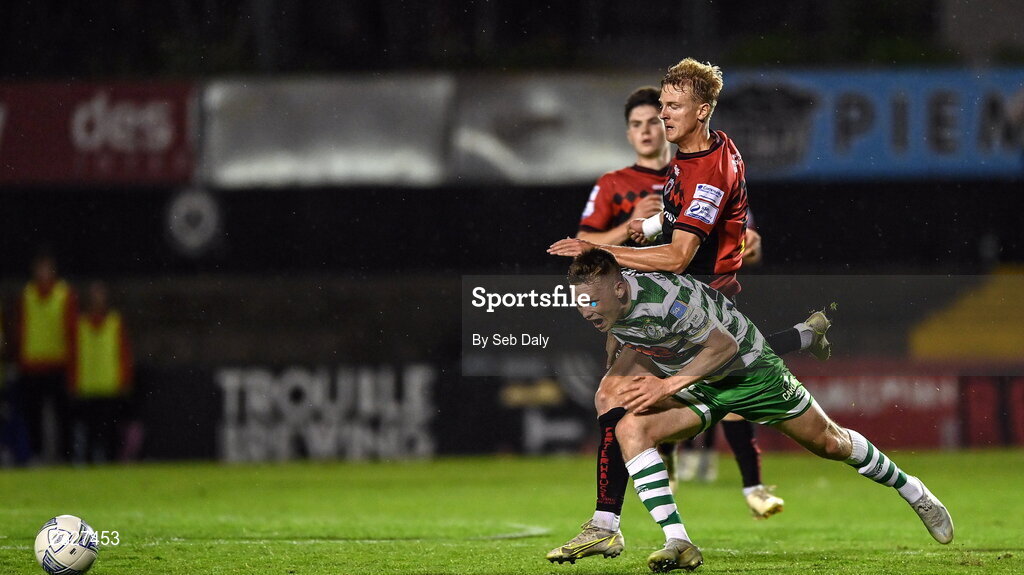 2 September 2022; Andy Lyons of Shamrock Rovers in action against Kris Twardek of Bohemians during the SSE Airtricity League Premier Division match between Bohemians and Shamrock Rovers at Dalymount Park in Dublin. Photo by Seb Daly/Sportsfile
