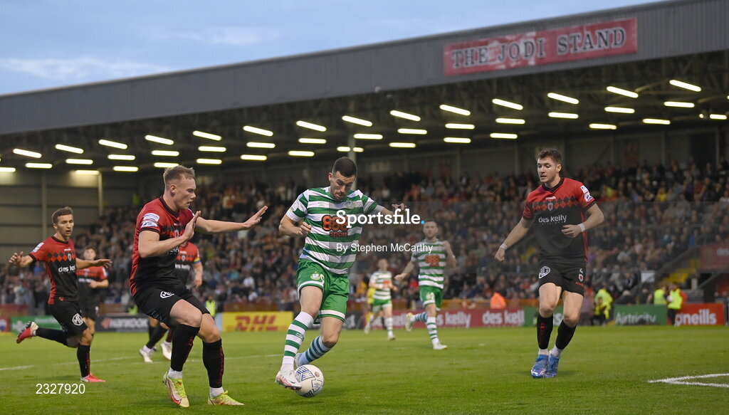 2 September 2022; Aaron Greene of Shamrock Rovers in action against Ciarán Kelly, left, and Rory Feely of Bohemians during the SSE Airtricity League Premier Division match between Bohemians and Shamrock Rovers at Dalymount Park in Dublin. Photo by Stephen McCarthy/Sportsfile