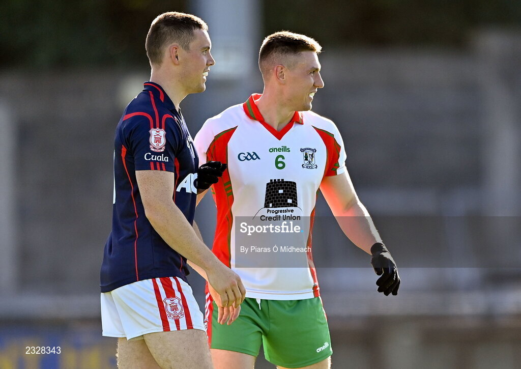 4 September 2022; Con O'Callaghan of Cuala and John Small of Ballymun Kickhams during the Dublin County Senior Club Football Championship Group 2 match between Cuala and Ballymun Kickhams at Parnell Park in Dublin. Photo by Piaras Ó Mídheach/Sportsfile
