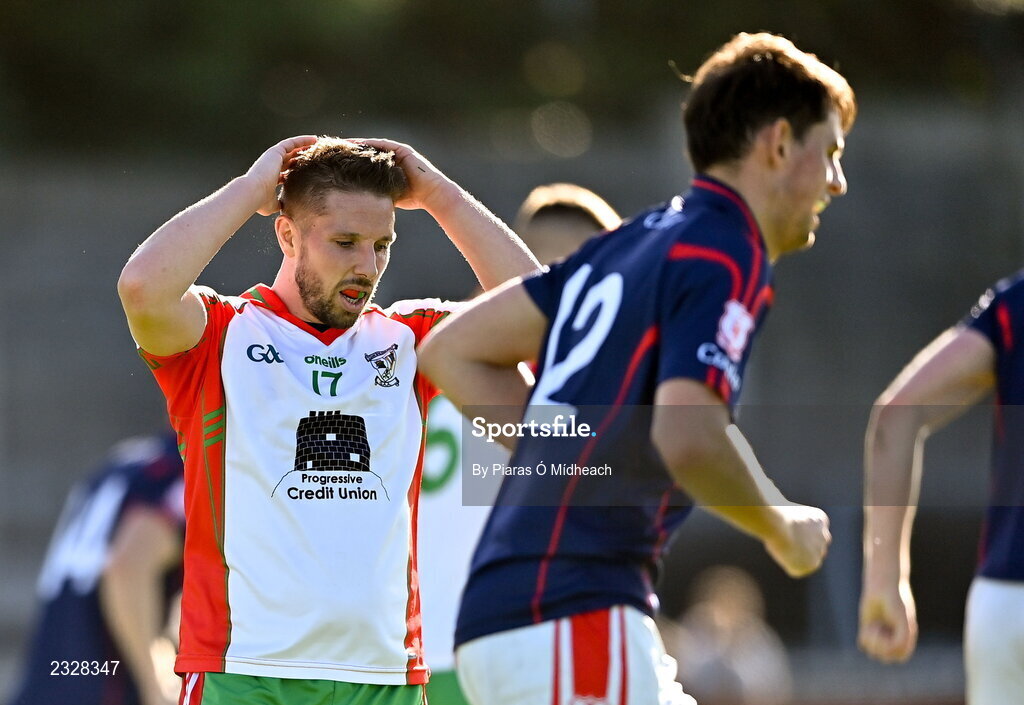 4 September 2022; Alan Hubbard of Ballymun Kickhams reacts after a goal by Niall James of Cuala, 12, during the Dublin County Senior Club Football Championship Group 2 match between Cuala and Ballymun Kickhams at Parnell Park in Dublin. Photo by Piaras Ó Mídheach/Sportsfile