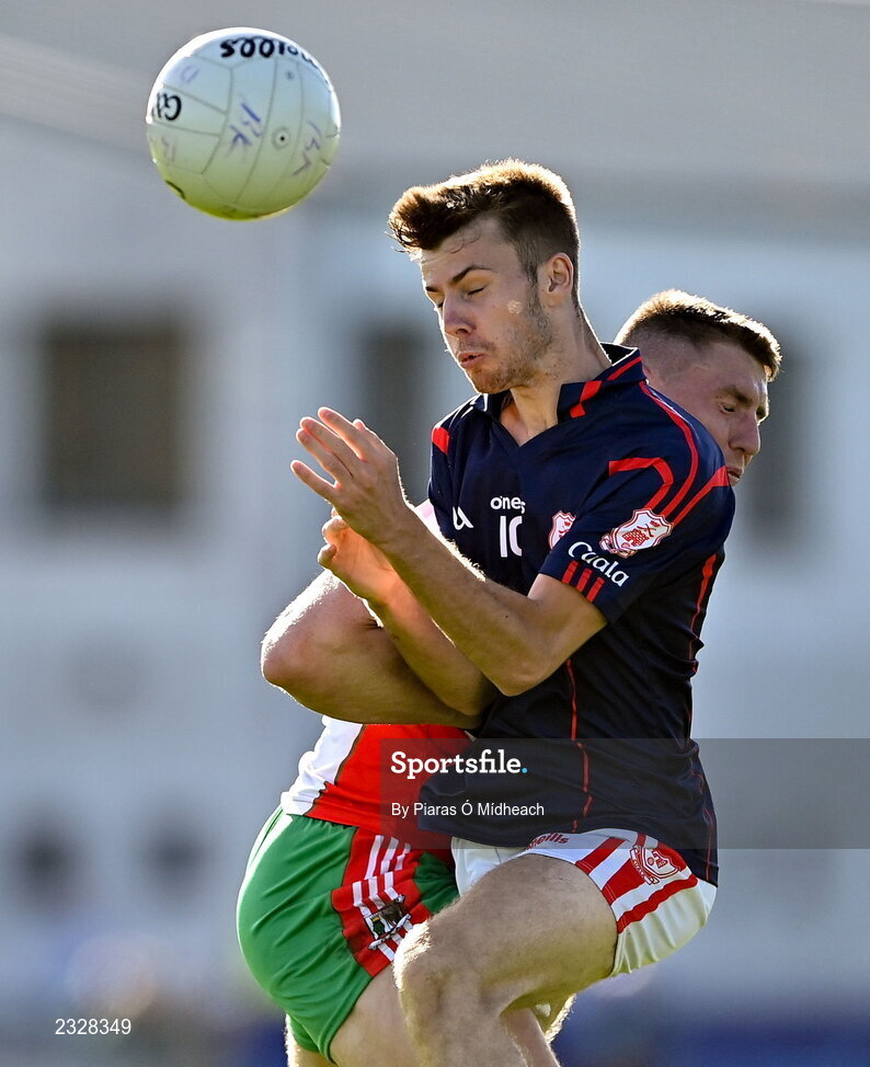 4 September 2022; Cal Doran of Cuala is tackled by John Small of Ballymun Kickhams during the Dublin County Senior Club Football Championship Group 2 match between Cuala and Ballymun Kickhams at Parnell Park in Dublin. Photo by Piaras Ó Mídheach/Sportsfile