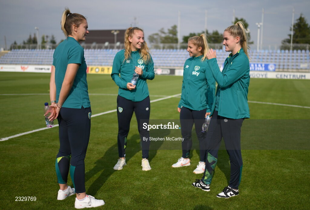 6 September 2022; Republic of Ireland players, from left, Saoirse Noonan, Aoibheann Clancy, Ellen Molloy and Jessie Stapleton before the FIFA Women's World Cup 2023 Qualifier match between Slovakia and Republic of Ireland at National Training Centre in Senec, Slovakia. Photo by Stephen McCarthy/Sportsfile