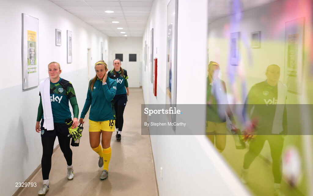 6 September 2022; Republic of Ireland players, from left, Courtney Brosnan, Grace Moloney and Megan Walsh before the FIFA Women's World Cup 2023 Qualifier match between Slovakia and Republic of Ireland at National Training Centre in Senec, Slovakia. Photo by Stephen McCarthy/Sportsfile
