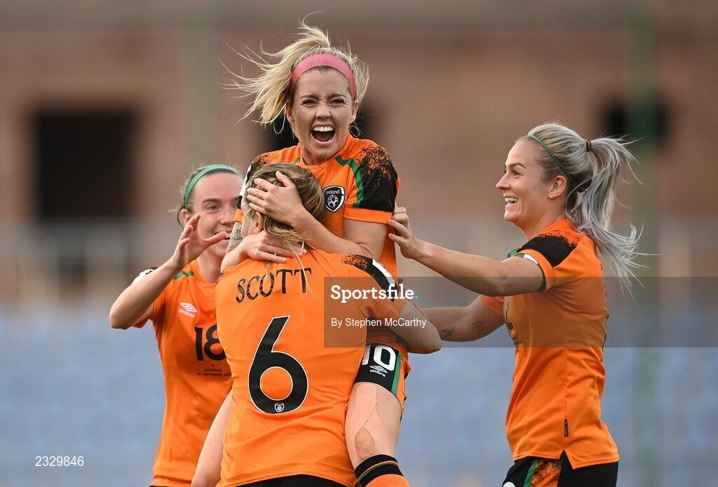 6 September 2022; Denise O'Sullivan of Republic of Ireland celebrates with teammates after scoring their side's first goal during the FIFA Women's World Cup 2023 Qualifier match between Slovakia and Republic of Ireland at National Training Centre in Senec, Slovakia. Photo by Stephen McCarthy/Sportsfile