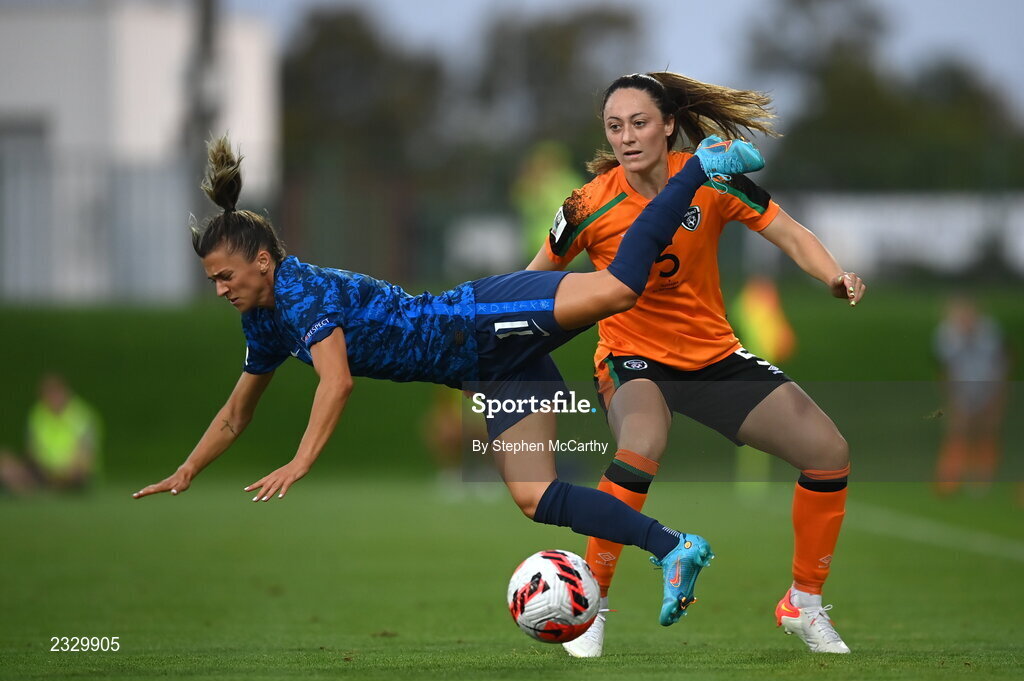 6 September 2022; Patrícia Hmírová of Slovakia is tackled by Megan Campbell of Republic of Ireland during the FIFA Women's World Cup 2023 Qualifier match between Slovakia and Republic of Ireland at National Training Centre in Senec, Slovakia. Photo by Stephen McCarthy/Sportsfile