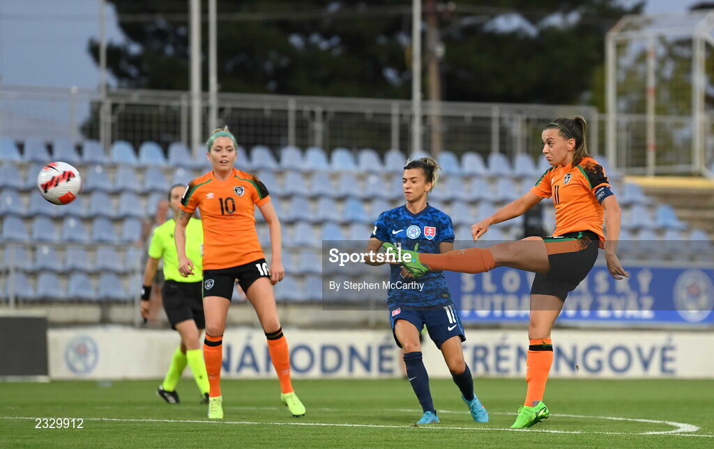6 September 2022; Katie McCabe of Republic of Ireland has a shot on goal during the FIFA Women's World Cup 2023 Qualifier match between Slovakia and Republic of Ireland at National Training Centre in Senec, Slovakia. Photo by Stephen McCarthy/Sportsfile