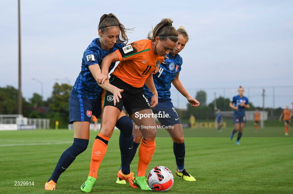 6 September 2022; Katie McCabe of Republic of Ireland in action against Kristína Košíková, left, and Andrea Horvathova of Slovakia during the FIFA Women's World Cup 2023 Qualifier match between Slovakia and Republic of Ireland at National Training Centre in Senec, Slovakia. Photo by Stephen McCarthy/Sportsfile