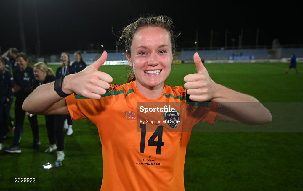 6 September 2022; Heather Payne of Republic of Ireland celebrates after the FIFA Women's World Cup 2023 Qualifier match between Slovakia and Republic of Ireland at National Training Centre in Senec, Slovakia. Photo by Stephen McCarthy/Sportsfile