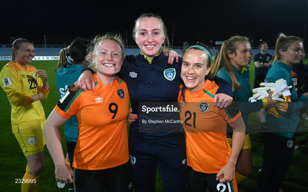 6 September 2022; Republic of Ireland players Amber Barrett, left, and Ciara Grant, right, with Republic of Ireland StatSports technician Niamh McDaid after the FIFA Women's World Cup 2023 Qualifier match between Slovakia and Republic of Ireland at National Training Centre in Senec, Slovakia. Photo by Stephen McCarthy/Sportsfile