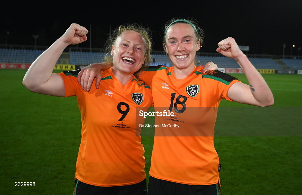 6 September 2022; Amber Barrett, left, and Claire O'Riordan of Republic of Ireland after the FIFA Women's World Cup 2023 Qualifier match between Slovakia and Republic of Ireland at National Training Centre in Senec, Slovakia. Photo by Stephen McCarthy/Sportsfile