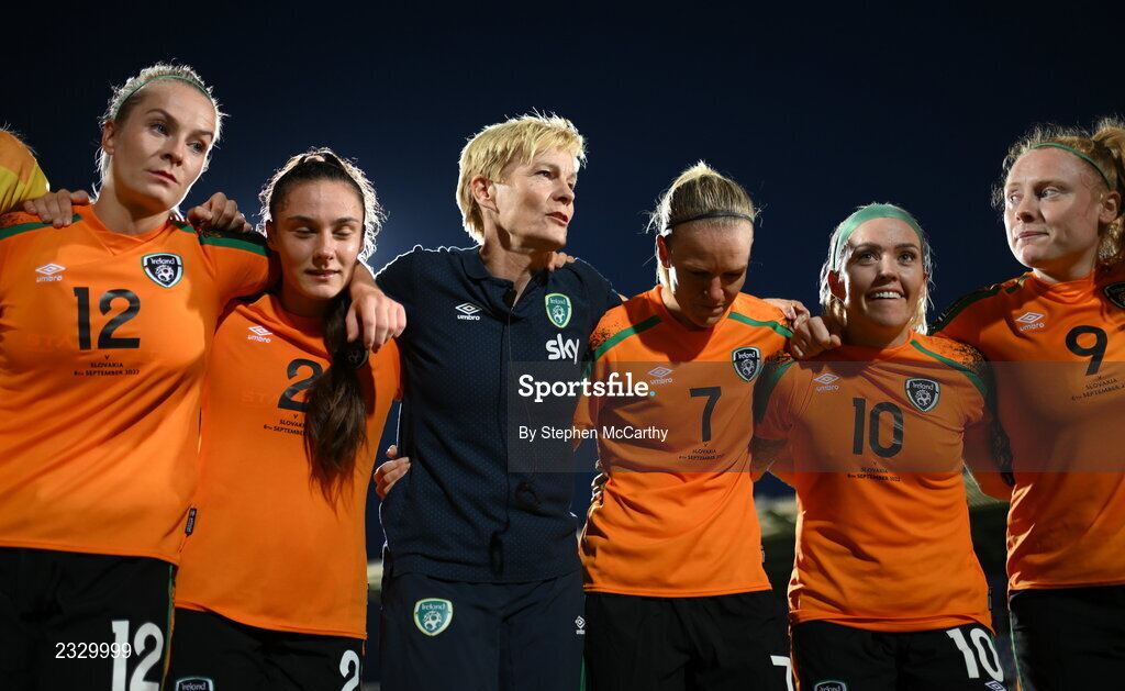 6 September 2022; Republic of Ireland manager Vera Pauw with her players after the FIFA Women's World Cup 2023 Qualifier match between Slovakia and Republic of Ireland at National Training Centre in Senec, Slovakia. Photo by Stephen McCarthy/Sportsfile