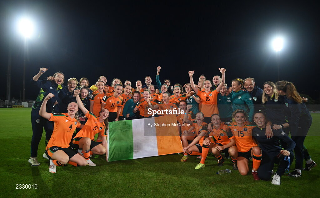 6 September 2022; Republic of Ireland players and staff celebrate after the FIFA Women's World Cup 2023 Qualifier match between Slovakia and Republic of Ireland at National Training Centre in Senec, Slovakia. Photo by Stephen McCarthy/Sportsfile