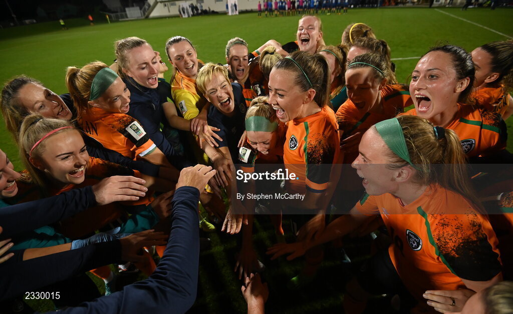6 September 2022; Republic of Ireland captain Katie McCabe leads the celebrations in the huddle after the FIFA Women's World Cup 2023 Qualifier match between Slovakia and Republic of Ireland at National Training Centre in Senec, Slovakia. Photo by Stephen McCarthy/Sportsfile