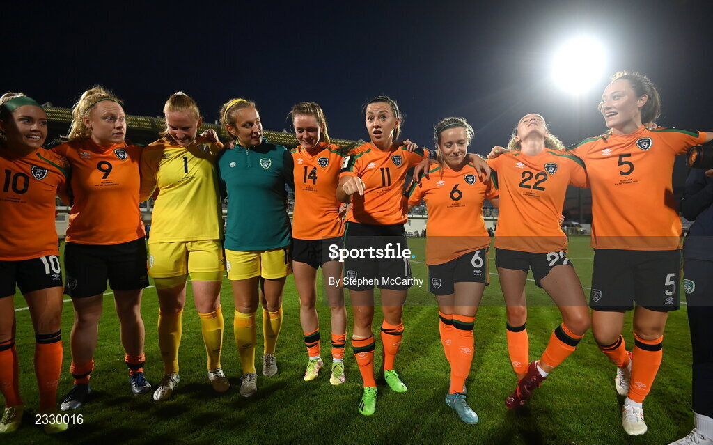 6 September 2022; Republic of Ireland captain Katie McCabe talks to her teammates in the huddle after the FIFA Women's World Cup 2023 Qualifier match between Slovakia and Republic of Ireland at National Training Centre in Senec, Slovakia. Photo by Stephen McCarthy/Sportsfile