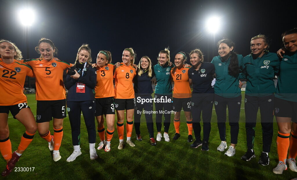 6 September 2022; Republic of Ireland players and staff in the huddle after the FIFA Women's World Cup 2023 Qualifier match between Slovakia and Republic of Ireland at National Training Centre in Senec, Slovakia. Photo by Stephen McCarthy/Sportsfile