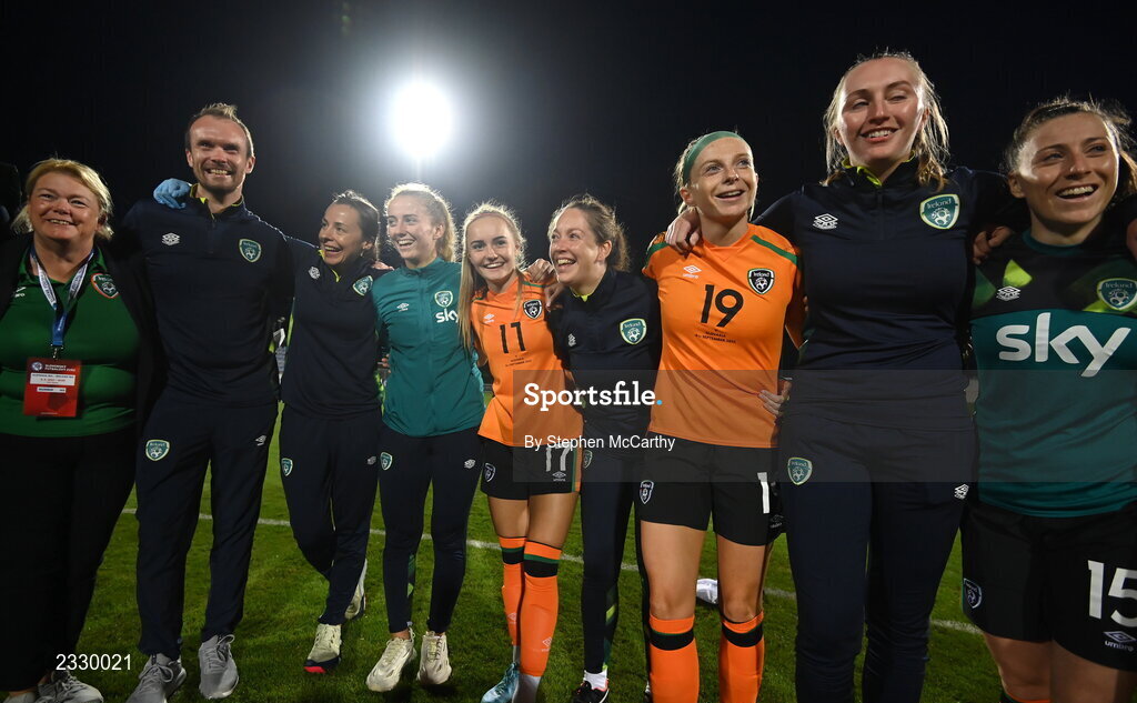 6 September 2022; Republic of Ireland players and staff in the huddle after the FIFA Women's World Cup 2023 Qualifier match between Slovakia and Republic of Ireland at National Training Centre in Senec, Slovakia. Photo by Stephen McCarthy/Sportsfile
