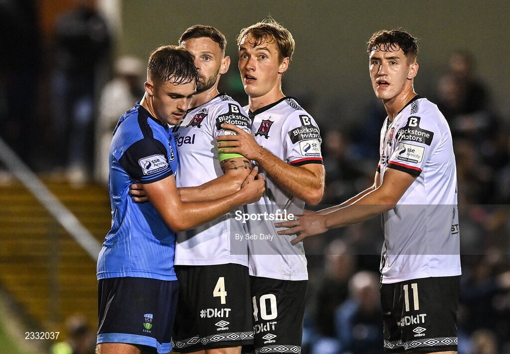 9 September 2022; Evan Caffrey of UCD, with Dundalk players, from left, Andy Boyle, Greg Sloggett and John Martin during the SSE Airtricity League Premier Division match between UCD and Dundalk at UCD Bowl in Dublin. Photo by Seb Daly/Sportsfile