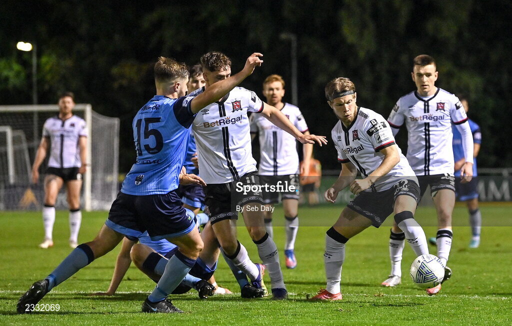 9 September 2022; Runar Hauge of Dundalk, right, during the SSE Airtricity League Premier Division match between UCD and Dundalk at UCD Bowl in Dublin. Photo by Seb Daly/Sportsfile