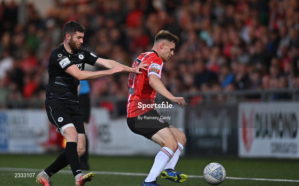 13 September 2022; Cameron McJannet of Derry City in action against Aidan Keena of Sligo Rovers during the SSE Airtricity League Premier Division match between Derry City and Sligo Rovers at The Ryan McBride Brandywell Stadium in Derry. Photo by Ramsey Cardy/Sportsfile