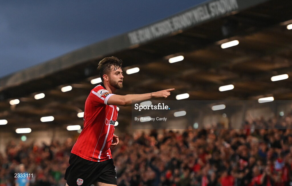 13 September 2022; Will Patching of Derry City celebrates after scoring his side's first goal during the SSE Airtricity League Premier Division match between Derry City and Sligo Rovers at The Ryan McBride Brandywell Stadium in Derry. Photo by Ramsey Cardy/Sportsfile