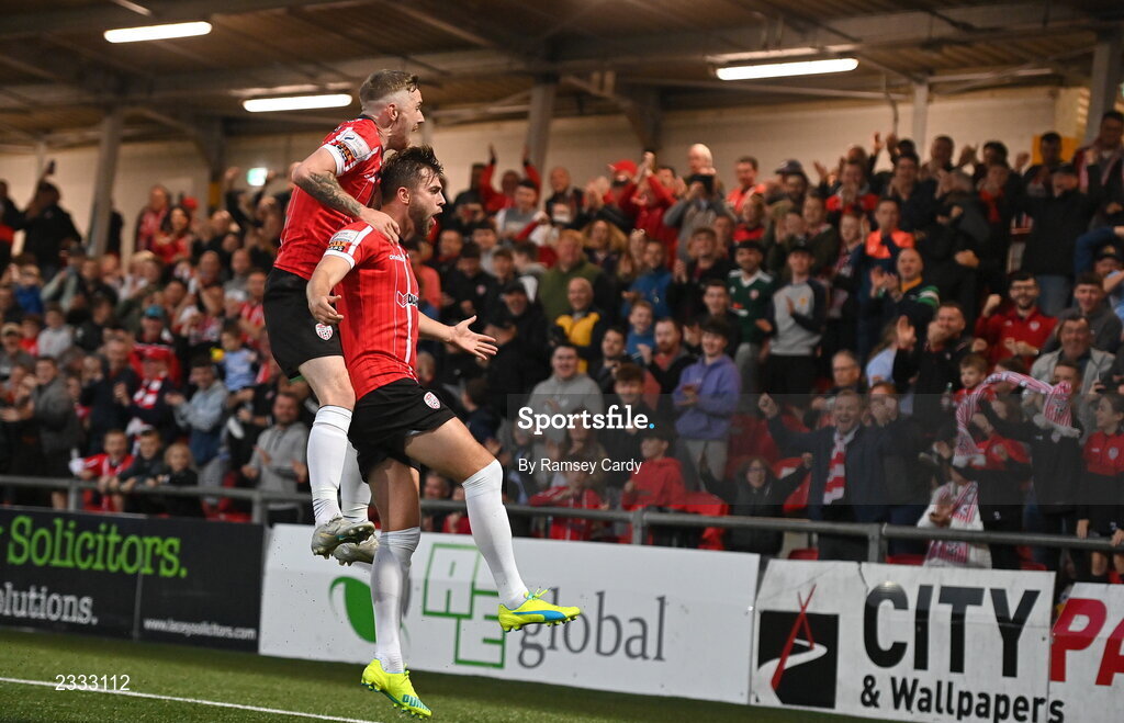 13 September 2022; Will Patching of Derry City celebrates with Jamie McGonigle, left, after scoring their side's first goal during the SSE Airtricity League Premier Division match between Derry City and Sligo Rovers at The Ryan McBride Brandywell Stadium in Derry. Photo by Ramsey Cardy/Sportsfile