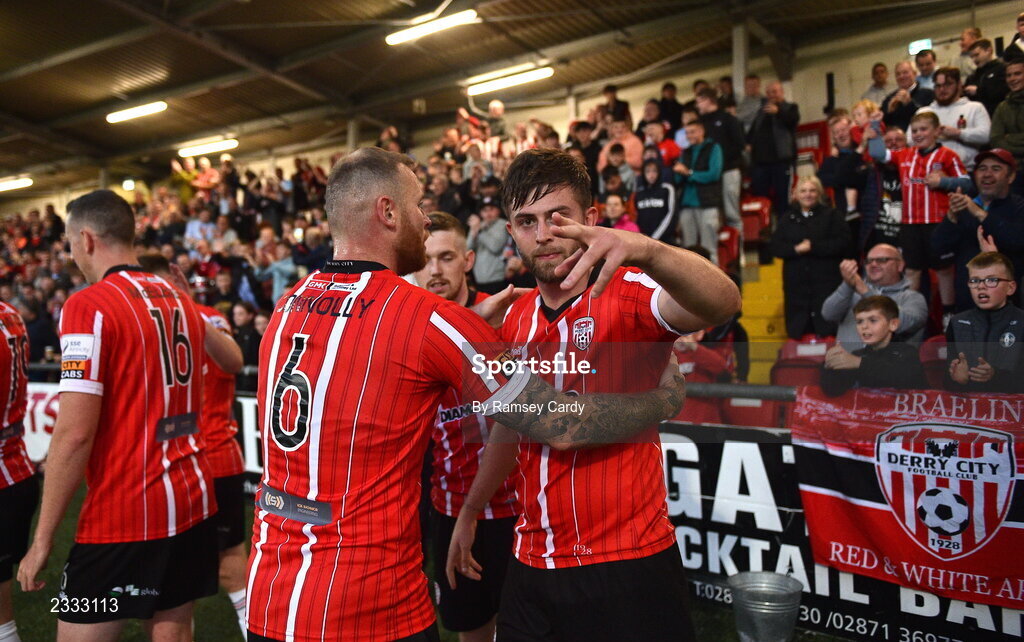 13 September 2022; Will Patching of Derry City, right, celebrates after scoring his side's first goal during the SSE Airtricity League Premier Division match between Derry City and Sligo Rovers at The Ryan McBride Brandywell Stadium in Derry. Photo by Ramsey Cardy/Sportsfile