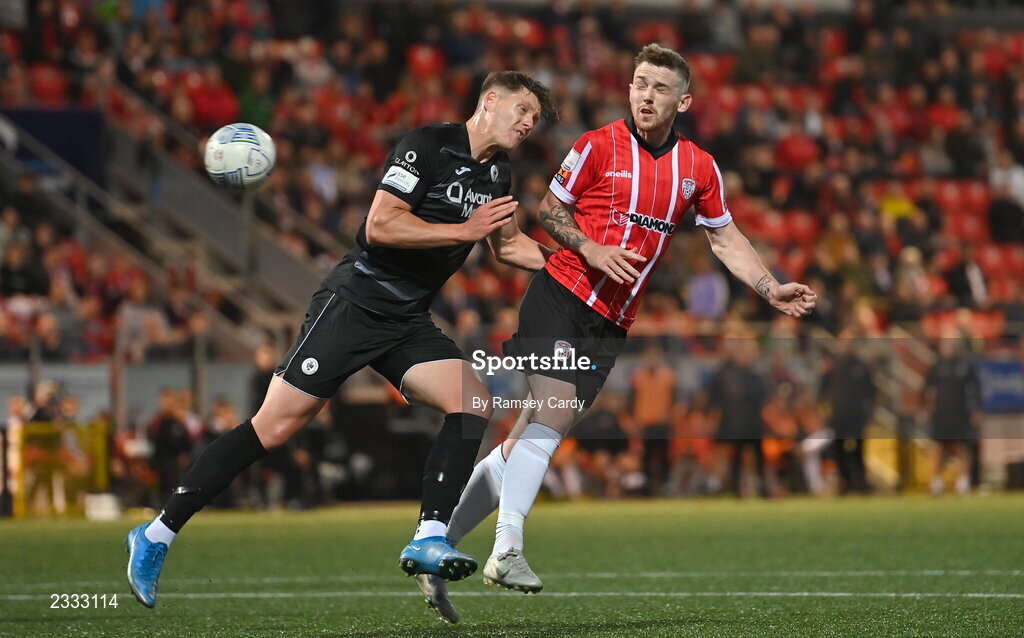 13 September 2022; Jamie McGonigle of Derry City in action against Nando Pijnaker of Sligo Rovers during the SSE Airtricity League Premier Division match between Derry City and Sligo Rovers at The Ryan McBride Brandywell Stadium in Derry. Photo by Ramsey Cardy/Sportsfile