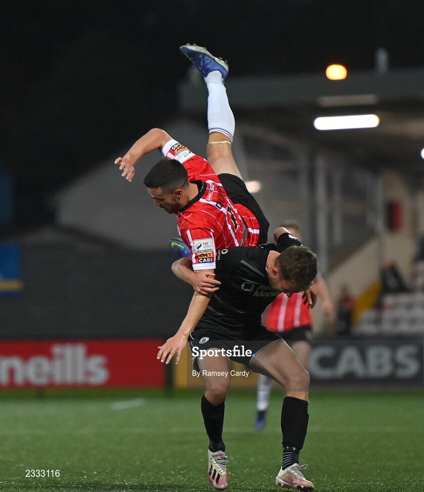 13 September 2022; Michael Duffy of Derry City and Lewis Banks of Sligo Rovers during the SSE Airtricity League Premier Division match between Derry City and Sligo Rovers at The Ryan McBride Brandywell Stadium in Derry. Photo by Ramsey Cardy/Sportsfile