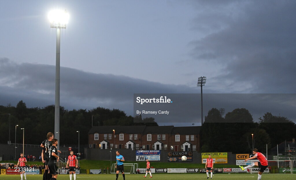 13 September 2022; Will Patching of Derry City shoots to score his side's first goal, from a free kick, during the SSE Airtricity League Premier Division match between Derry City and Sligo Rovers at The Ryan McBride Brandywell Stadium in Derry. Photo by Ramsey Cardy/Sportsfile