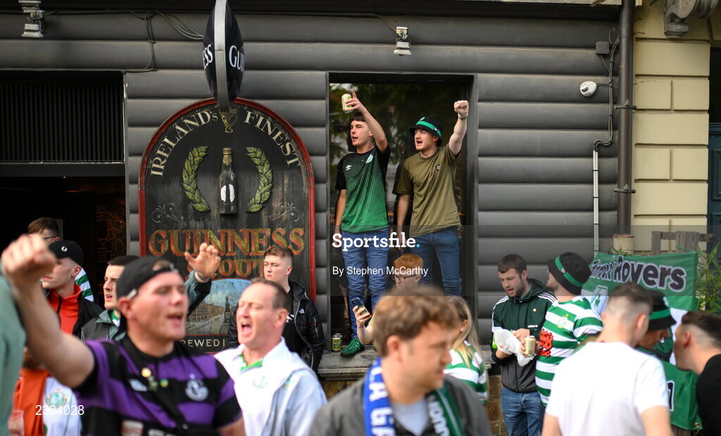 15 September 2022; Shamrock Rovers supporters outside Patrick Foleys Irish pub before the UEFA Europa Conference League Group F match between Gent and Shamrock Rovers at KAA Gent Stadium in Gent, Belgium. Photo by Stephen McCarthy/Sportsfile