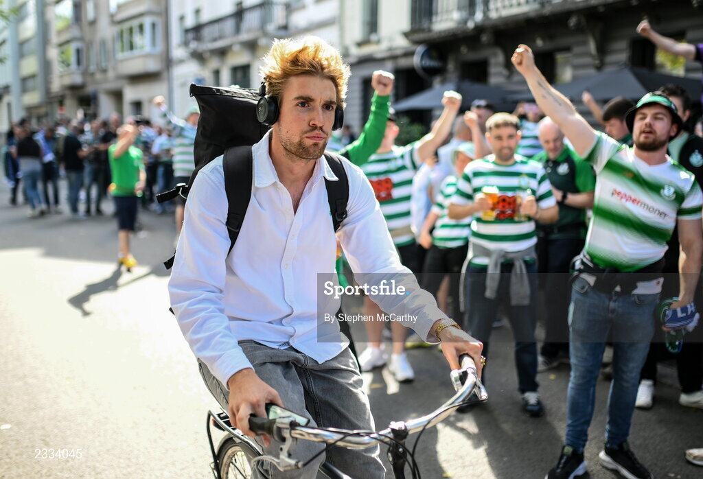 15 September 2022; A local cycles past Shamrock Rovers supporters before the UEFA Europa Conference League Group F match between Gent and Shamrock Rovers at KAA Gent Stadium in Gent, Belgium. Photo by Stephen McCarthy/Sportsfile