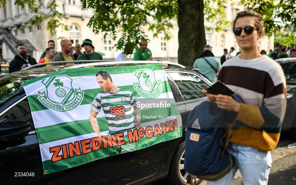 15 September 2022; A view of a Shamrock Rovers flag with a tribute to Chris McCann before the UEFA Europa Conference League Group F match between Gent and Shamrock Rovers at KAA Gent Stadium in Gent, Belgium. Photo by Stephen McCarthy/Sportsfile
