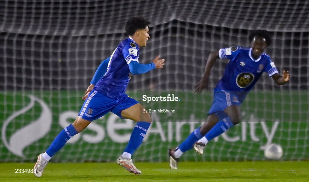 16 September 2022; Phoenix Patterson of Waterford, left, celebrates after scoring his side's third goal during the Extra.ie FAI Cup Quarter-Final match between Waterford and Dundalk at the RSC in Waterford. Photo by Ben McShane/Sportsfile