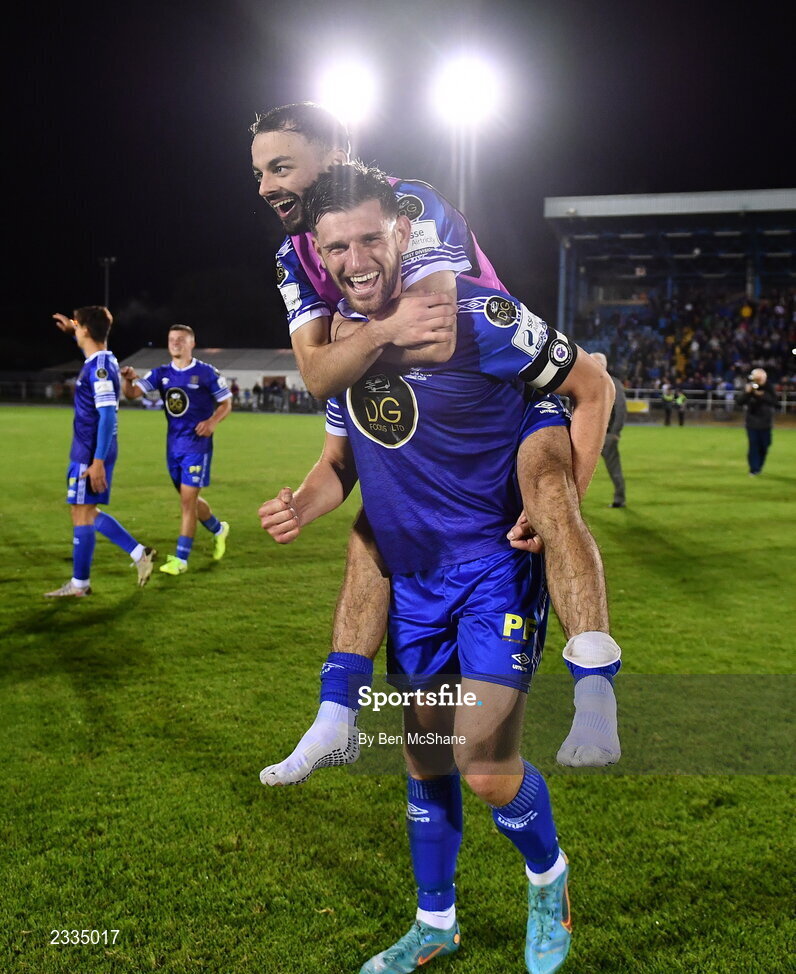 16 September 2022; Killian Cantwell, bottom, and Shane Griffin of Waterford celebrate after the Extra.ie FAI Cup Quarter-Final match between Waterford and Dundalk at the RSC in Waterford. Photo by Ben McShane/Sportsfile