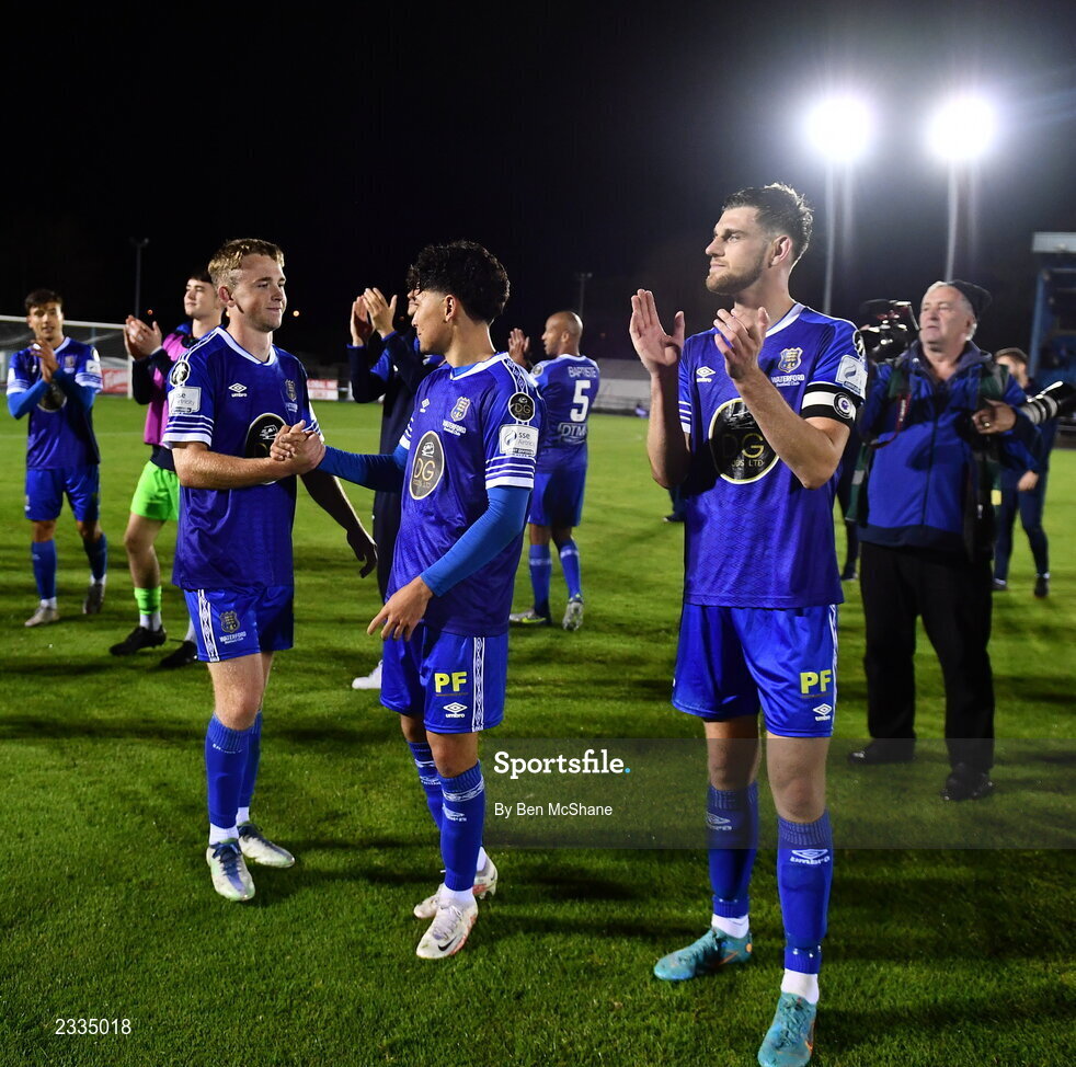 16 September 2022; Waterford players, from left, Darragh Power, Phoenix Patterson and Killian Cantwell after the Extra.ie FAI Cup Quarter-Final match between Waterford and Dundalk at the RSC in Waterford. Photo by Ben McShane/Sportsfile