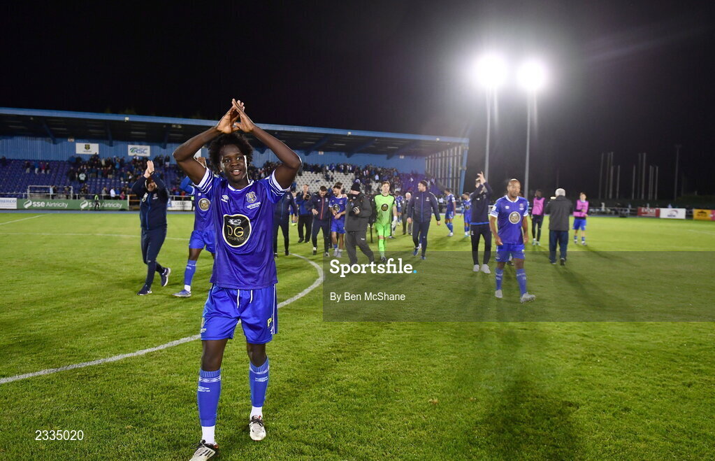 16 September 2022; Junior Quitirna of Waterford celebrates after the Extra.ie FAI Cup Quarter-Final match between Waterford and Dundalk at the RSC in Waterford. Photo by Ben McShane/Sportsfile