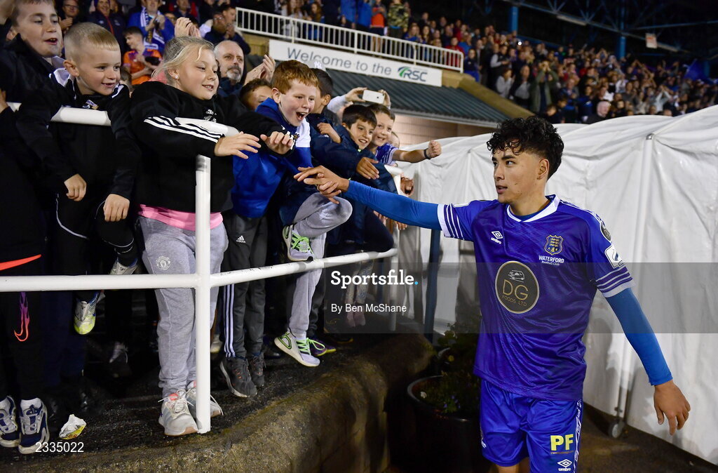 16 September 2022; Phoenix Patterson of Waterford with supporters after the Extra.ie FAI Cup Quarter-Final match between Waterford and Dundalk at the RSC in Waterford. Photo by Ben McShane/Sportsfile