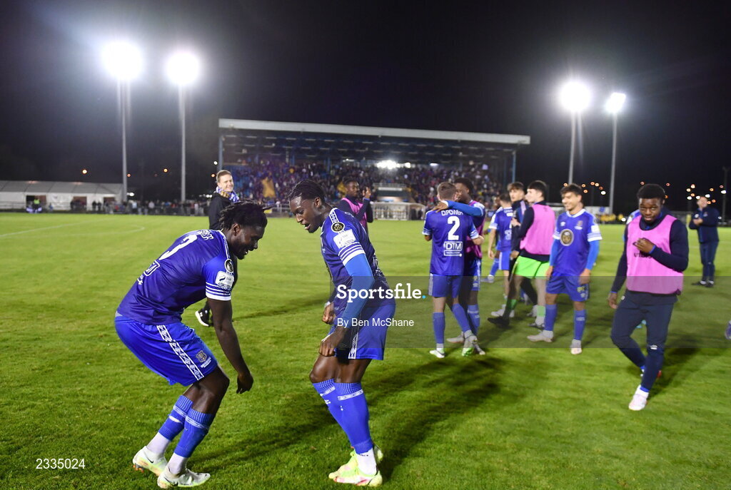 16 September 2022; Richard Taylor, left, and Tunmise Sobowale of Waterford celebrate after the Extra.ie FAI Cup Quarter-Final match between Waterford and Dundalk at the RSC in Waterford. Photo by Ben McShane/Sportsfile
