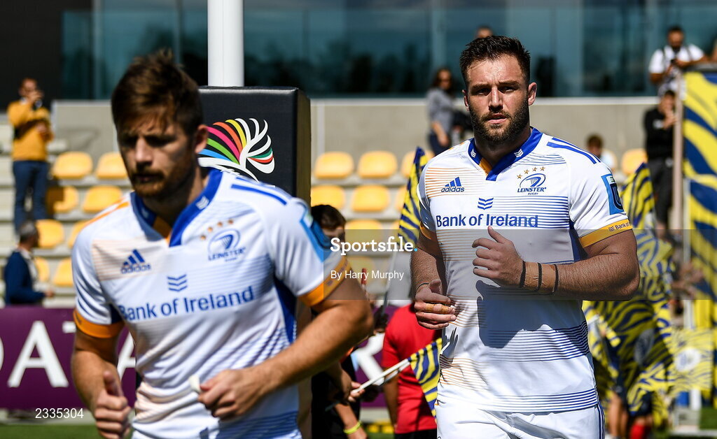 17 September 2022; Jason Jenkins of Leinster runs out for his debut before the United Rugby Championship match between Zebre Parma and Leinster at Stadio Sergio Lanfranchi in Parma, Italy. Photo by Harry Murphy/Sportsfile