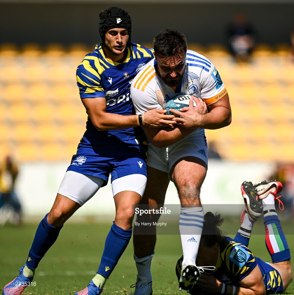 17 September 2022; Rónan Kelleher of Leinster is tackled by Simone Gesi, left, and Tiff Eden of Zebre Parma during the United Rugby Championship match between Zebre Parma and Leinster at Stadio Sergio Lanfranchi in Parma, Italy. Photo by Harry Murphy/Sportsfile