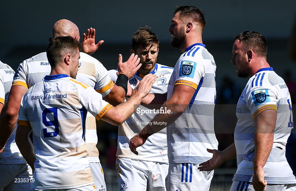 17 September 2022; Jason Jenkins of Leinster, second from right, celebrates with teammates after scoring his side's fourth try during the United Rugby Championship match between Zebre Parma and Leinster at Stadio Sergio Lanfranchi in Parma, Italy. Photo by Harry Murphy/Sportsfile