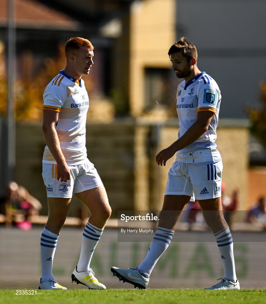 17 September 2022; Ciarán Frawley, left, and Ross Byrne of Leinster during the United Rugby Championship match between Zebre Parma and Leinster at Stadio Sergio Lanfranchi in Parma, Italy. Photo by Harry Murphy/Sportsfile